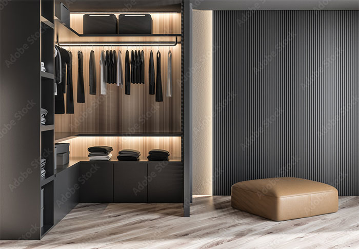 シックでスタイリッシュなマットブラック。上質なウォークインクローゼットは、ハイクラスのユーザーにふさわしい、特別な空間を演出します。