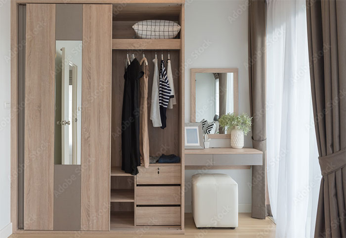 厳選された木材の風合いを活かした、美しい木目調のデザインは、空間を優しく包み込みます。細部までこだわった機能性で、使いやすさも抜群。落ちついた印象のクローゼットです。